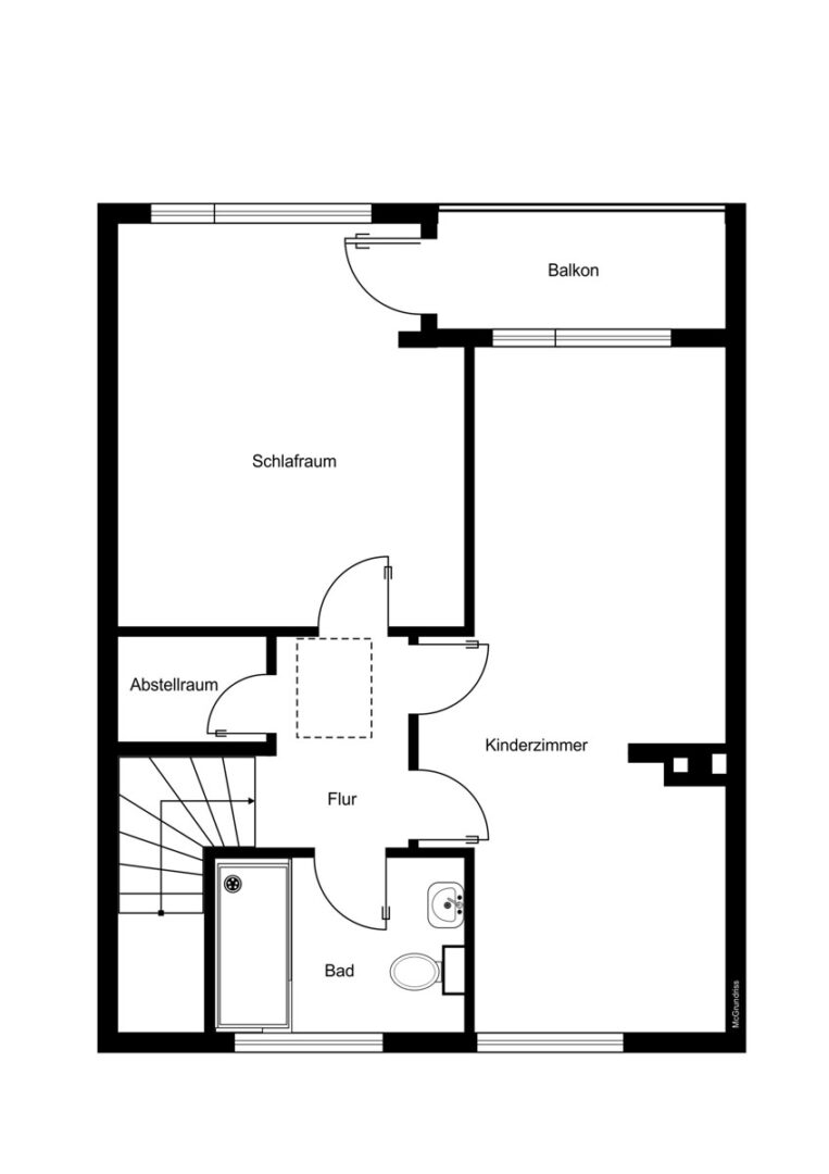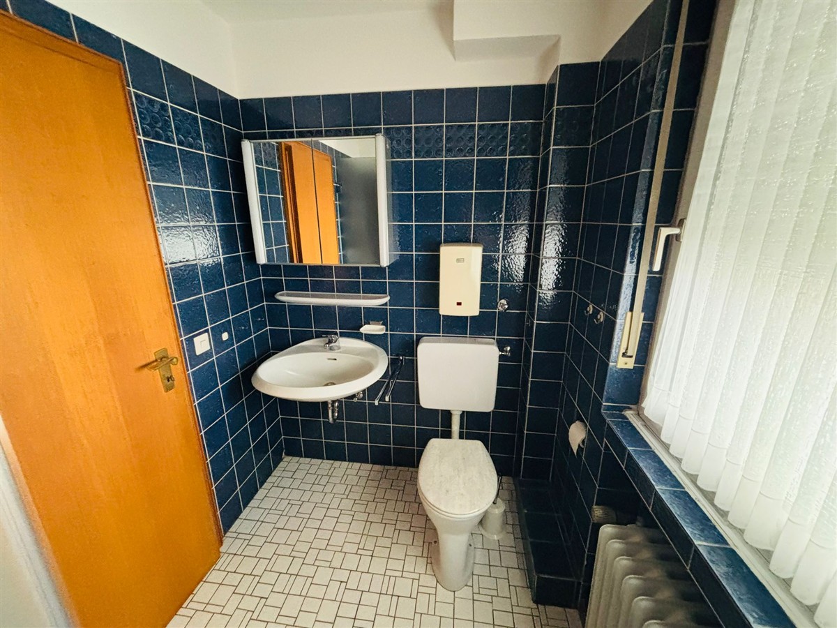 Das 1. Obergeschoss verfügt über ein Elternschlafzimmer mit Balkonzugang und ein größeres Kinderzimmer, welches auch durch den Einbau einer Zwischenwand in zwei Räume aufzuteilen wäre, da die zweite Türe bereits verbaut ist. Weiterhin befindet sich hier auch noch ein Abstellraum und ein Bad mit einer begehbaren Dusche und einer Glastrennwand, die erst in den letzten Jahren verbaut wurde. Die weitere Ausstattung des Bades entspricht dem Baujahr.
