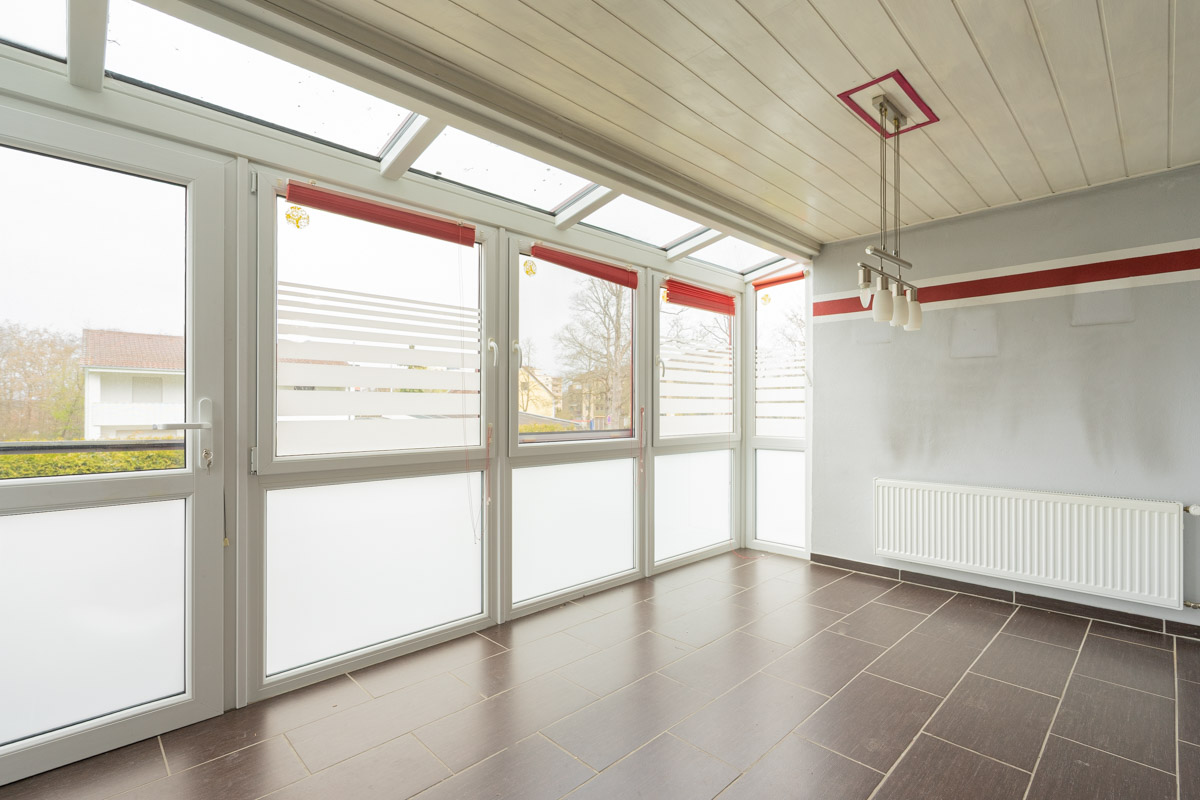 Im Erdgeschoss erwartet Sie ein großzügiges, lichtdurchflutetes Wohnzimmer mit Parkettboden, das eine angenehme Wohnatmosphäre schafft. Der angrenzende Wintergarten erweitert den Wohnraum und bietet über eine Treppe direkten Zugang in den Garten – ideal für entspannte Stunden oder gesellige Abende im Grünen. Im ursprünglichen Bereich des Erdgeschosses befinden sich zwei Schlafzimmer, eines davon derzeit als Büro genutzt, sowie eine geräumige Wohnküche mit praktischer Einbauküche. Das Tageslichtbad mit Eckbadewanne sorgt für zusätzlichen Komfort.