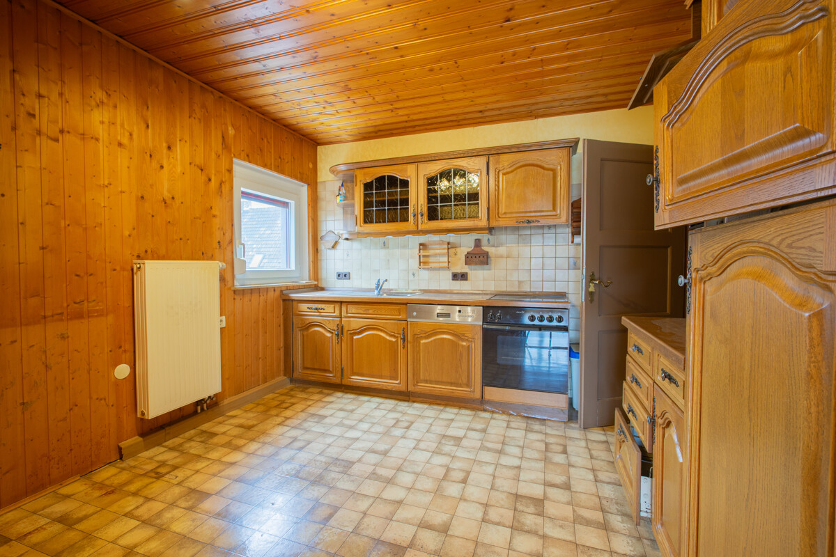 Das Dachgeschoss verfügt über einen ähnlichen Grundriss und bietet ein großes, helles Wohnzimmer mit Zugang zu einem Balkon und schönem Ausblick. Zwei Schlafzimmer sowie eine Wohnküche im charakteristischen Stil der 80er-Jahre eröffnen individuelle Gestaltungsmöglichkeiten. Ein Tageslichtbad mit Badewanne ergänzt diese Ebene. Über eine Zugtreppe im Flur gelangen Sie auf den ausgebauten Dachboden mit zwei Hobbyräumen und einem Kriechboden, der zusätzliche Stauraum bietet.